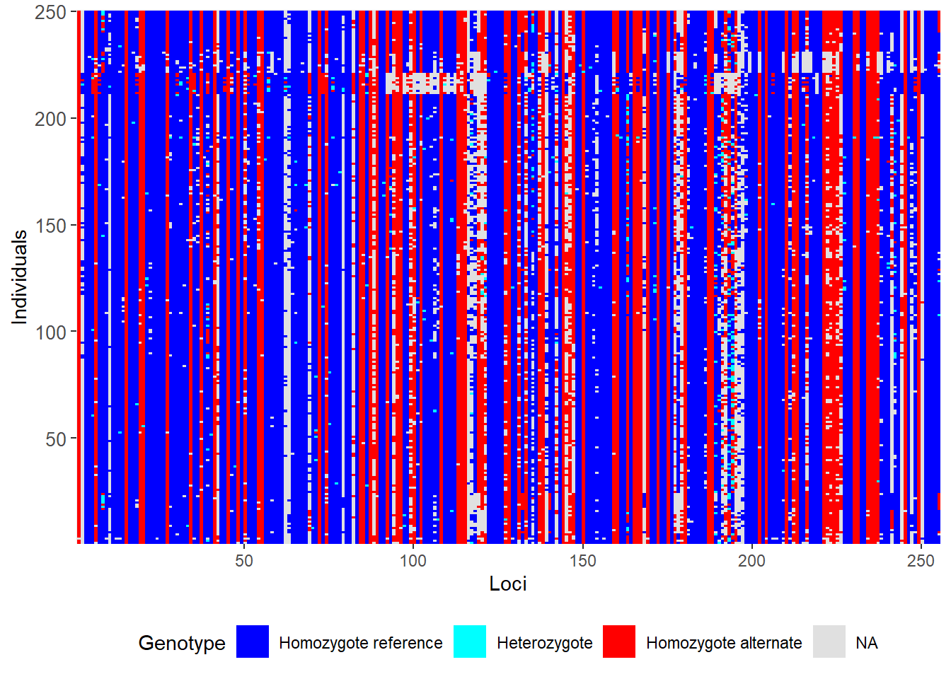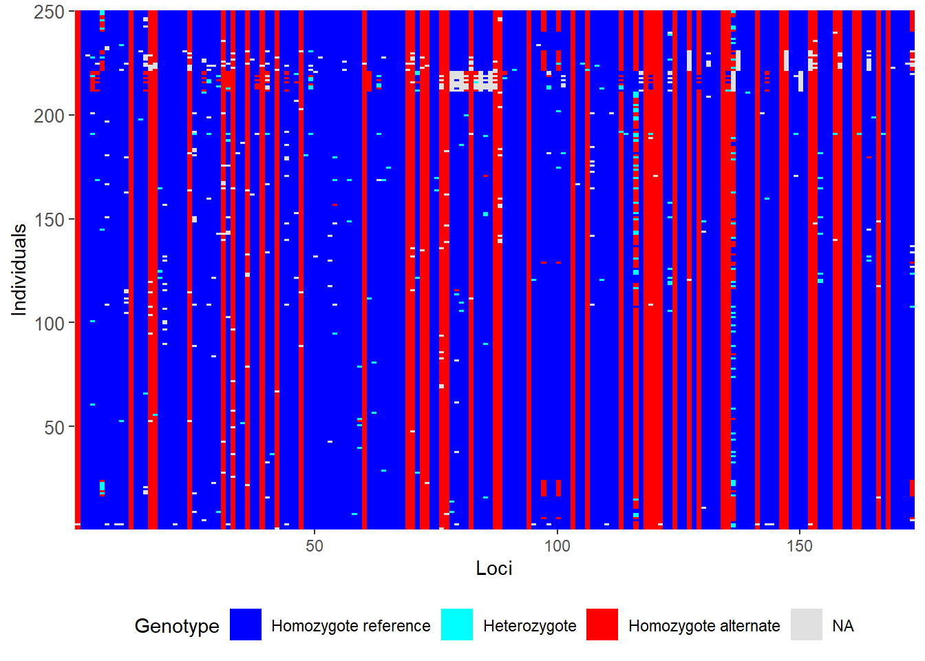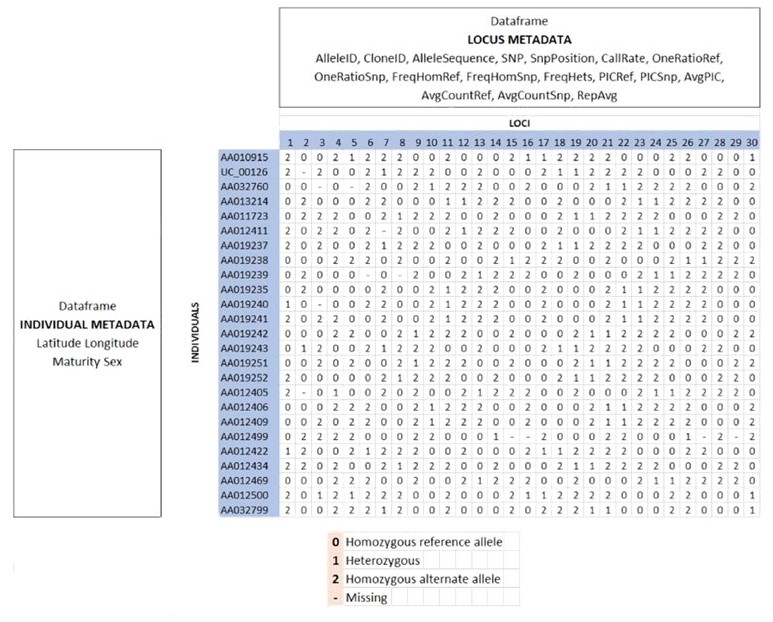 The data can be represented as SNP bases (A, T, C or G), with two states for each individual at each locus in a diploid organisms. Alternatively, because the data are biallelic, it is computationally convenient to code the data as 0 for homozyogotes for one allele, 1 for heterozygotes, and 2 for homozygotes of the other allele. The reference allele is arbitrarily taken to be the most common allele, so 0 is the score for homozygous reference, and 2 is the score for homozygous alternate or SNP state. NA indicates that the SNP could not be scored.