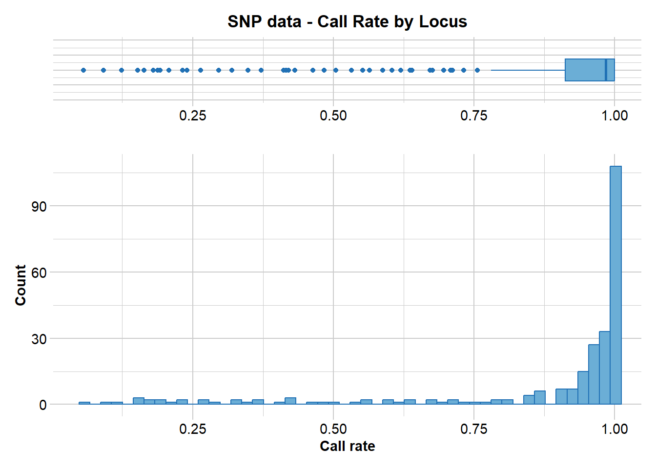 Note that the call rate is reported against locus. This is the default. Both a tabulated result and a graph is produced. You can use both to determine a suitable threshold for filtering on callrate.