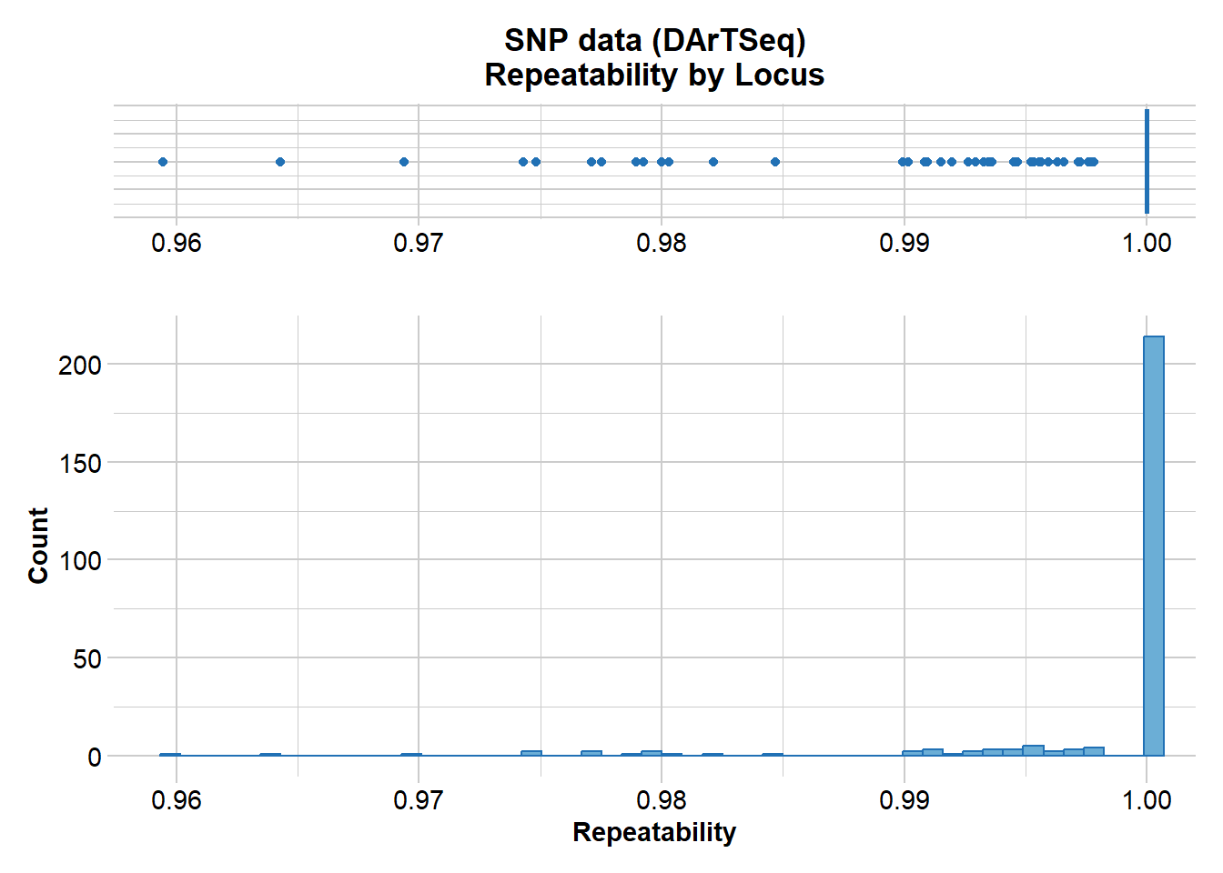 Recall that DArT runs a series of technical replicates as part of its routine workflow. This enables an assessment of the quality of data associated with each locus. What threshold do you think might be appropriate for a filter of reproducability?