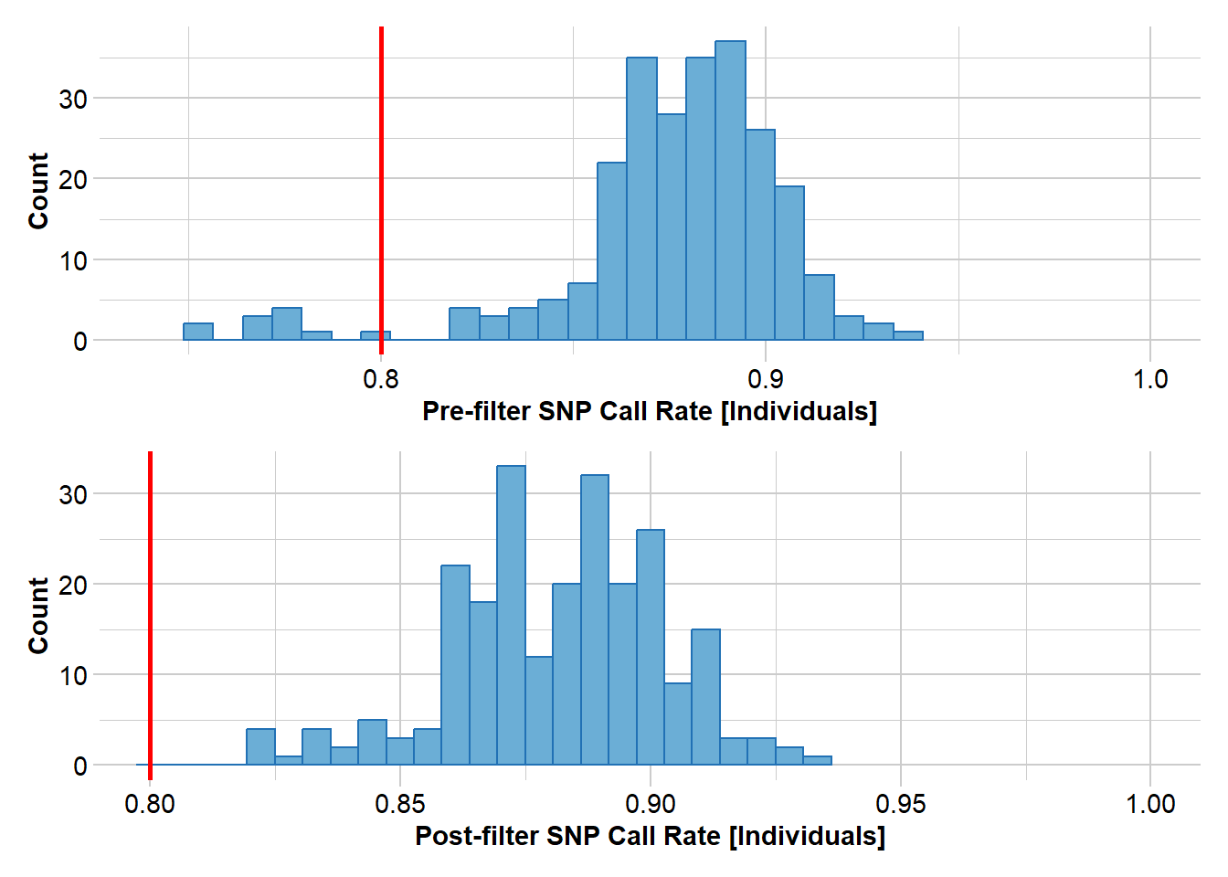 Can you see the difference. Again, both a tabulated result and a graph is produced. You can use both to determine a suitable threshold for filtering on callrate. What threshold do you think might be appropriate?