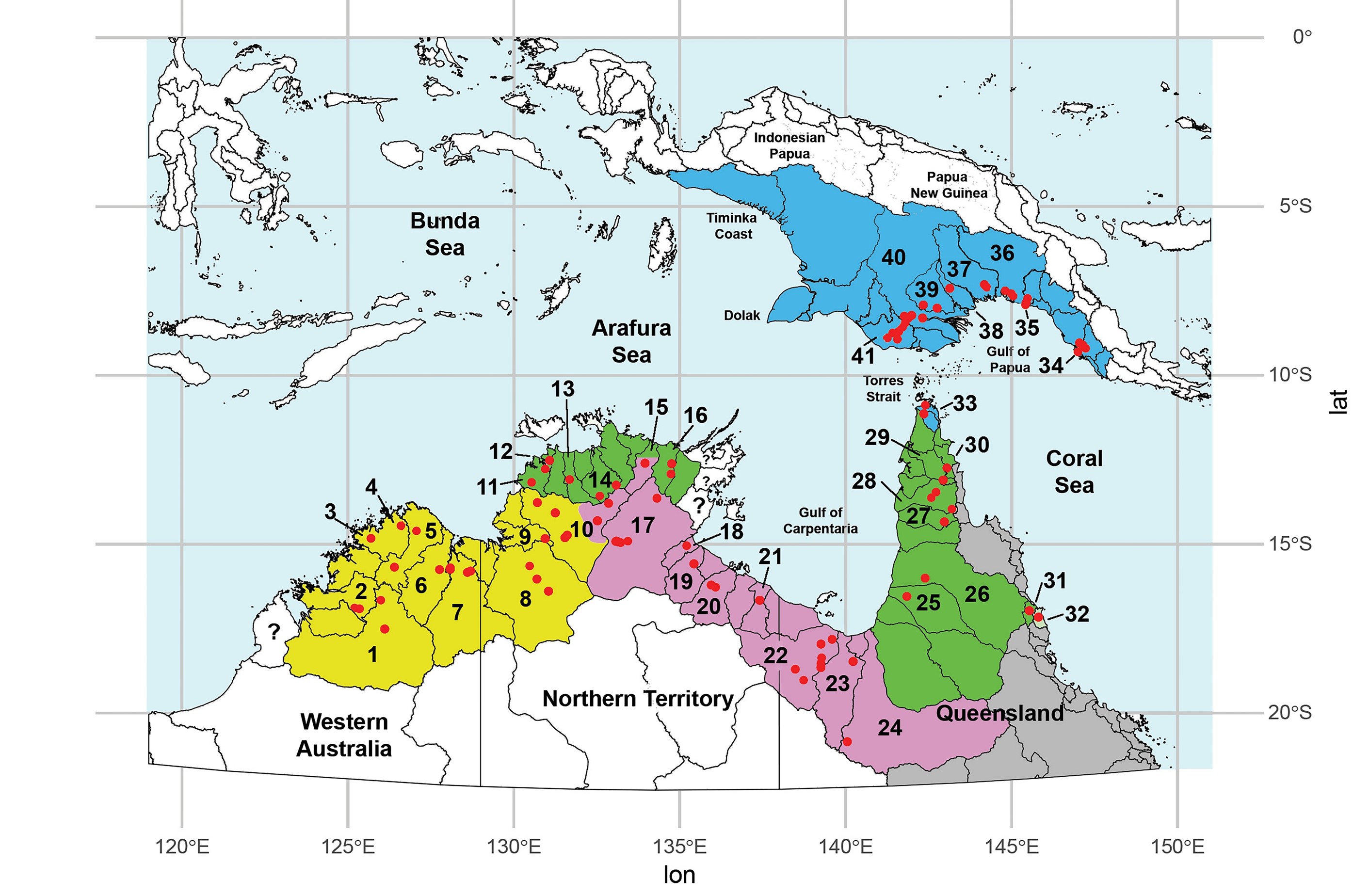Here is some context for our turtle example, below are two maps. The first is a map of eastern mainland Australia showing the distribution of the Emydura macquarii complex, the river drainage basins in which it occurs, and the broad regions, The second is of Northern Australia and Papua New Guinea.