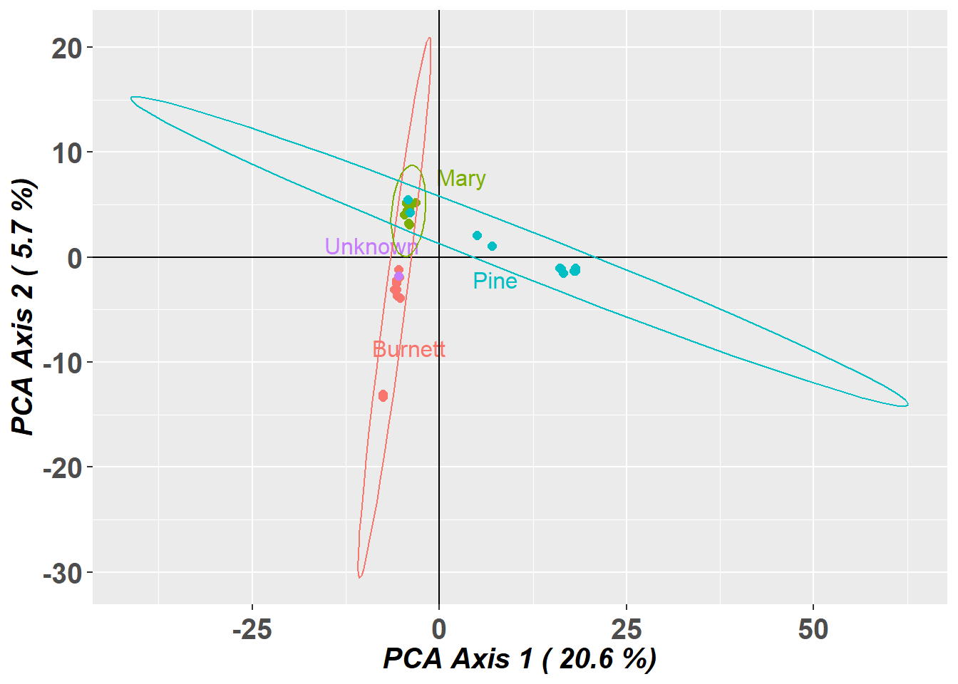 PCA: The genotype of a focal unknown individual is likely to lie within the confidence envelope of its source population than within the confidence envelope of other putative source populations.