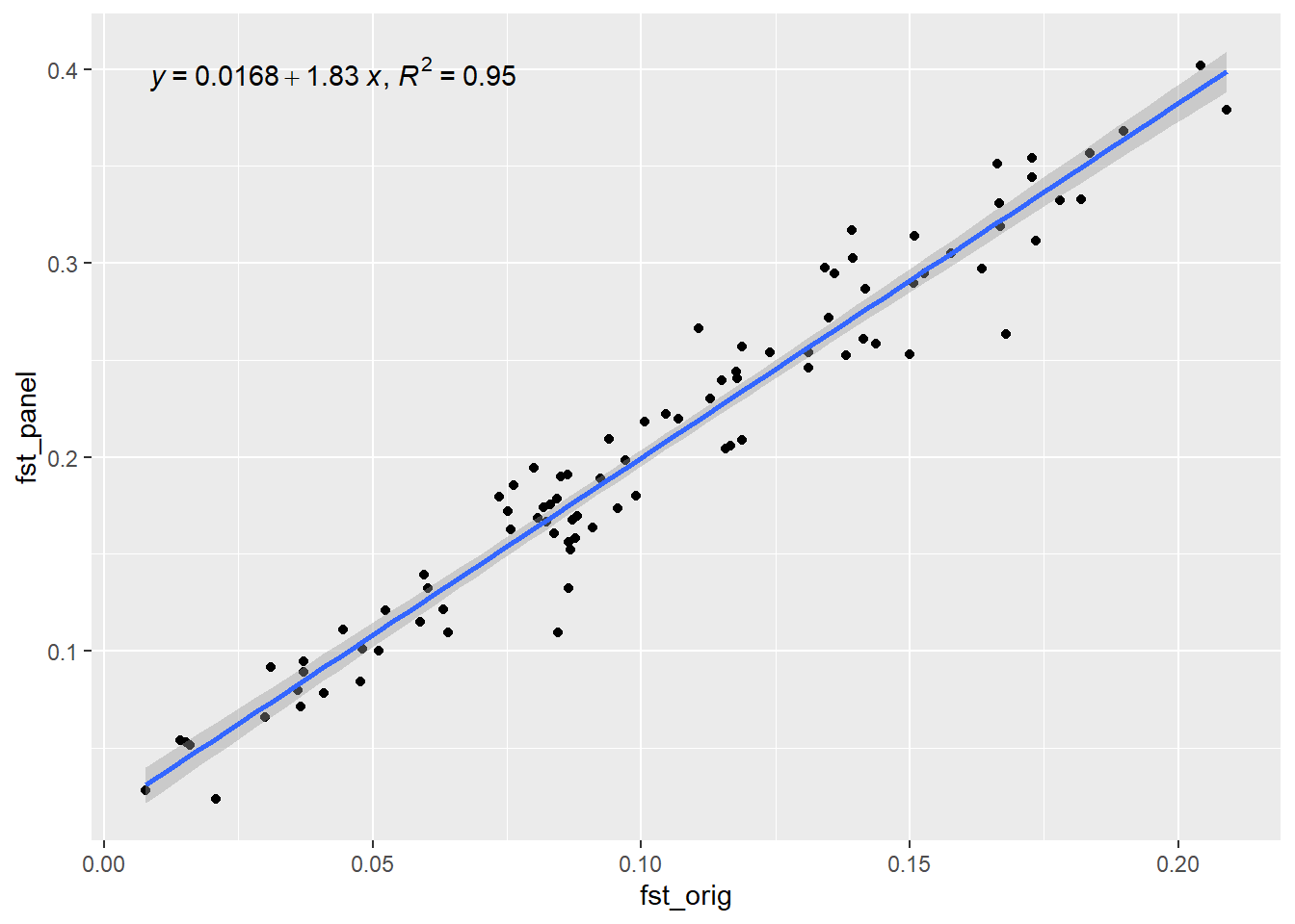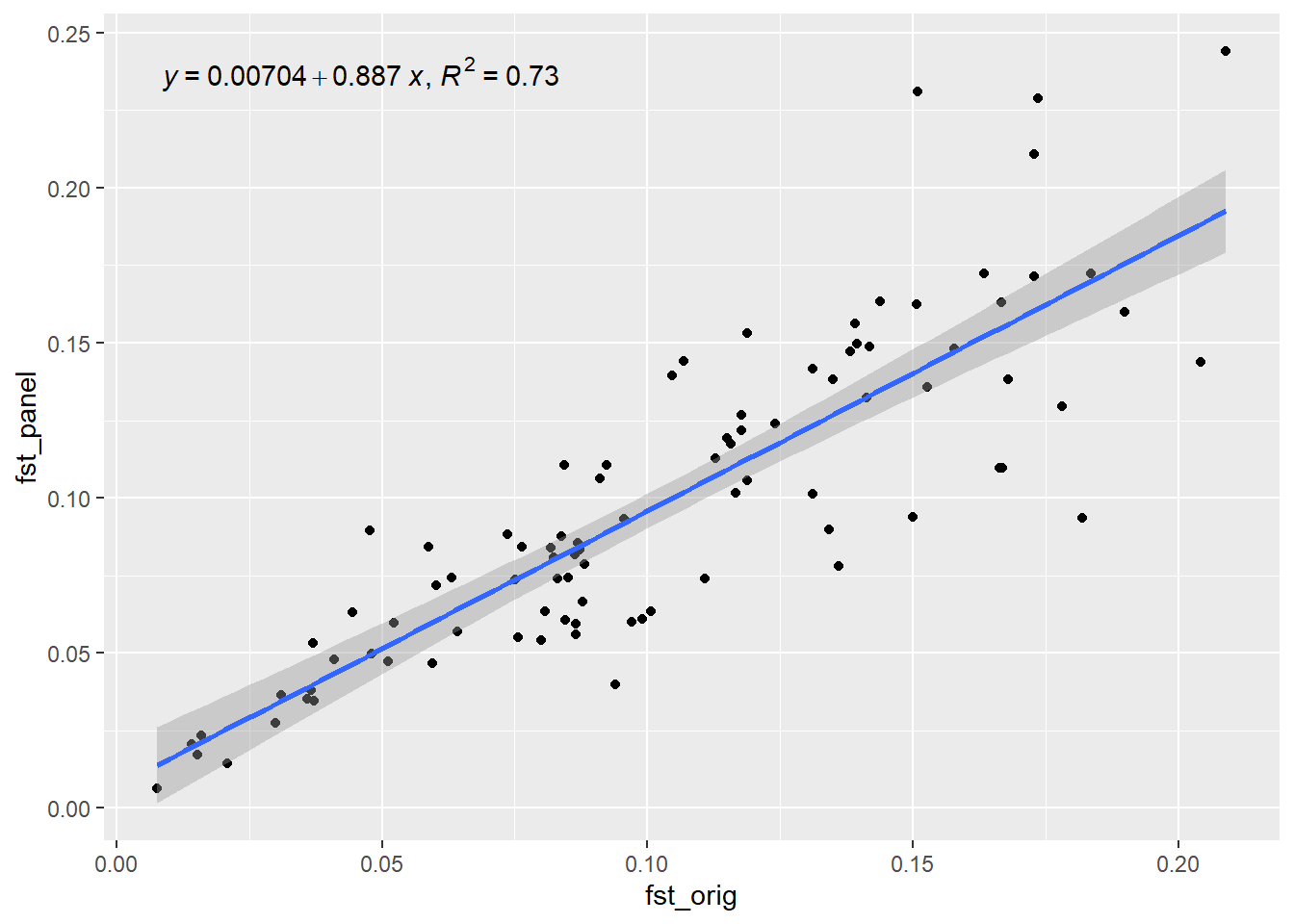 outdapc <- gl.check.panel(panel, rfbe20_6, parameter = "Fst")`geom_smooth()` using formula = 'y ~ x'