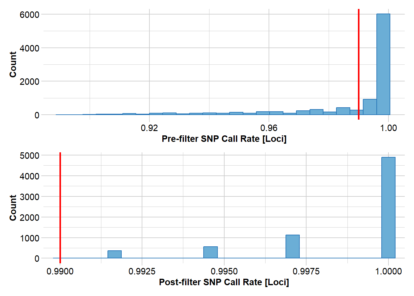 So we have 9849 SNPs (they are prefiltered for quality already). You can check the looking at callrate, rdepth). So we already have high quality SNPs, with a low missing value rate across loci.
