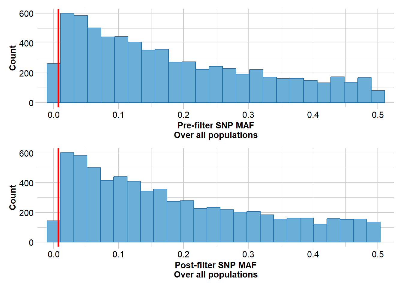 Because we have filtered the data by individual we want to make sure we have not created missing data in any of the populations and we want to filter also finally for minor allele frequency (MAF) using the count option as we want to make sure we have high quality SNPs which are not spurious in terms of aonly occuring in very low frequency.