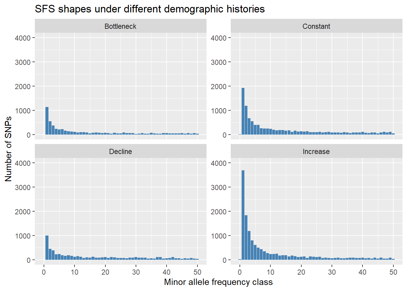 gl.LDNein the dartRverse, and understand the role of MAF filtering - Compute a Site Frequency Spectrum (SFS) from SNP data and interpret its shape