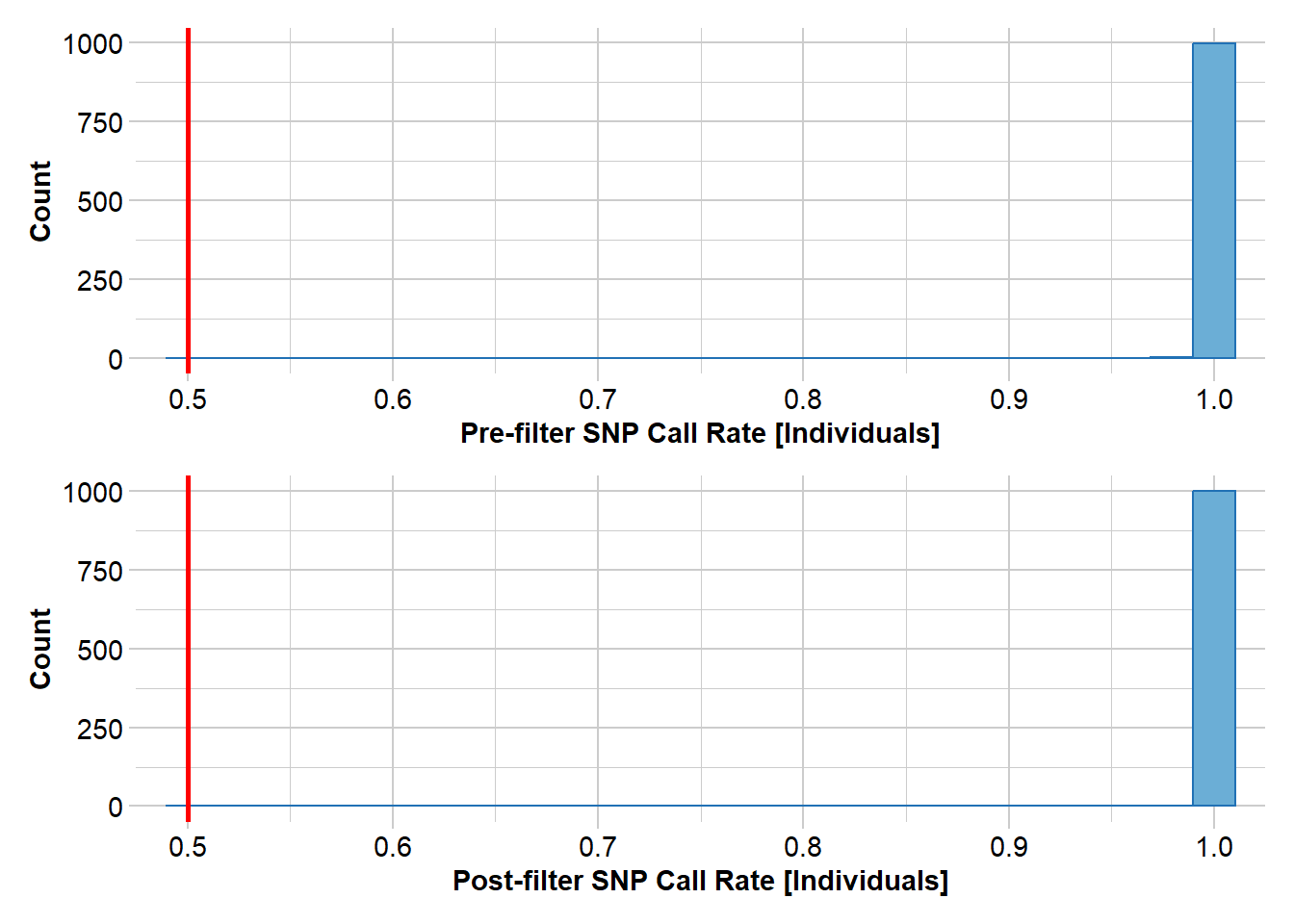 We’ll start with a simple sweep of the dataset, removing individuals with low call rate and filtering monomorphic loci, loci with excess heterozygosity, and low-frequency alleles.