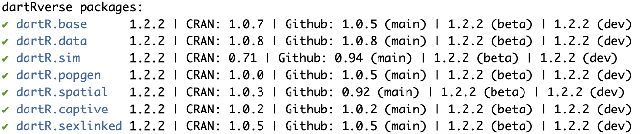We have developed a new suit of packages called “dartRverse” packages, that will replace the previous dartR package, which soon will be no longer supported. The new suit of packages are meant to be a 1:1 replacement and only in some instance very minor changes will be needed to update previous code. For example we reworked on the “output” of all functions, now being able to save figures in specified folders, which can be easier recovered and manipulated for further tweaking. The main reasons for splitting dartR into several packages and developing the dartRverse suit of packages was difficulty to maintain dartR, because of limits imposed by CRAN, but also limits due the the long time to test new function, when compiling the package. Therefore we were forced to split the package into several smaller packages. This has several advantages and in the best of all cases no disadvantages.